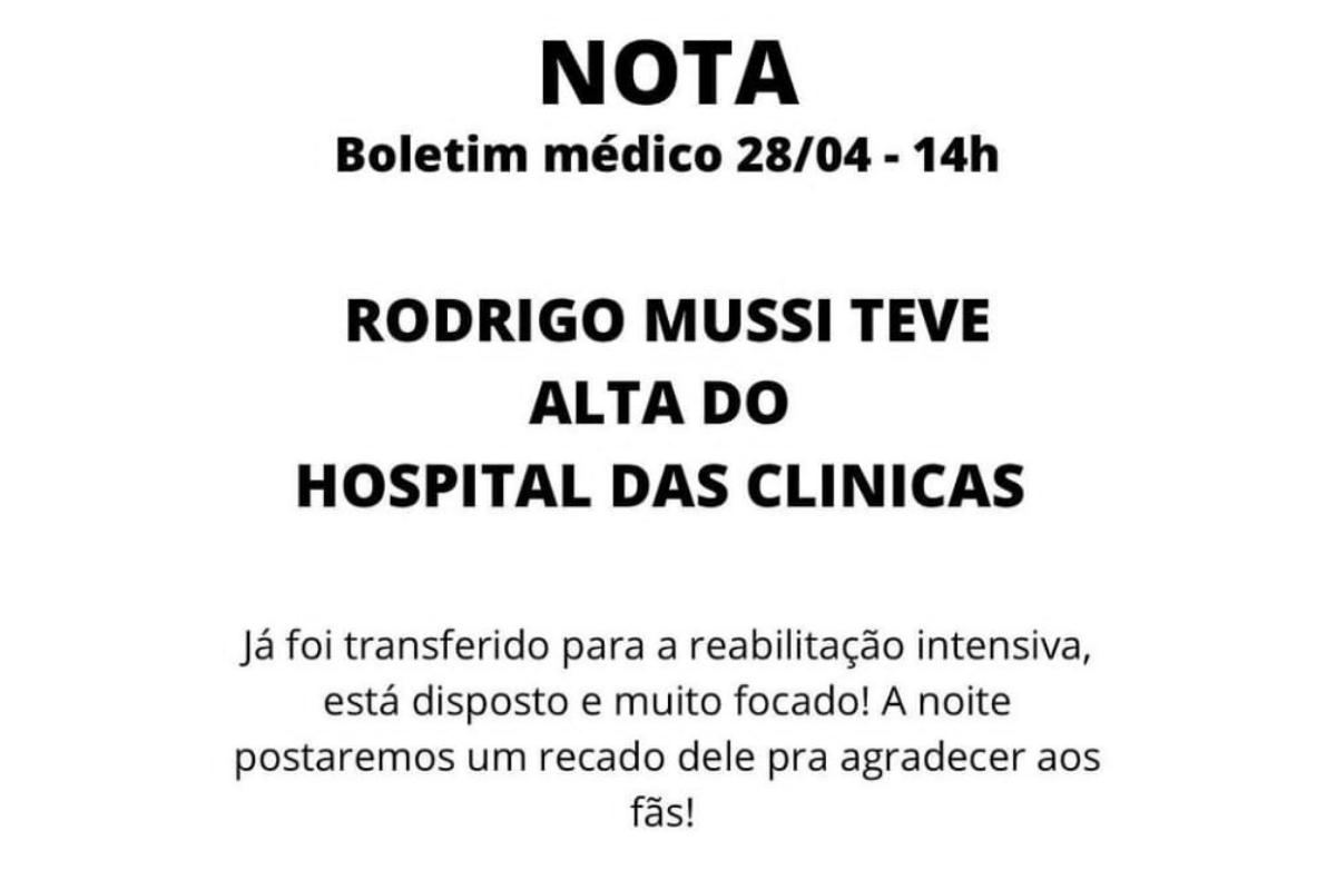 “Rodrigo Mussi a cada dia se recupera mais, essa semana terá alta do Hospital das Clínicas e será transferido para um local específico para o seu tipo de reabilitação intensiva!”, dizia o boletim médico mais recente divulgado pela família do modelo. “Hoje se alimentou super bem, fez a fisioterapia e a cada dia está menos confuso e mais lúcido. Todo dia é uma vitória”, concluiu o texto divulgado nas redes sociais.