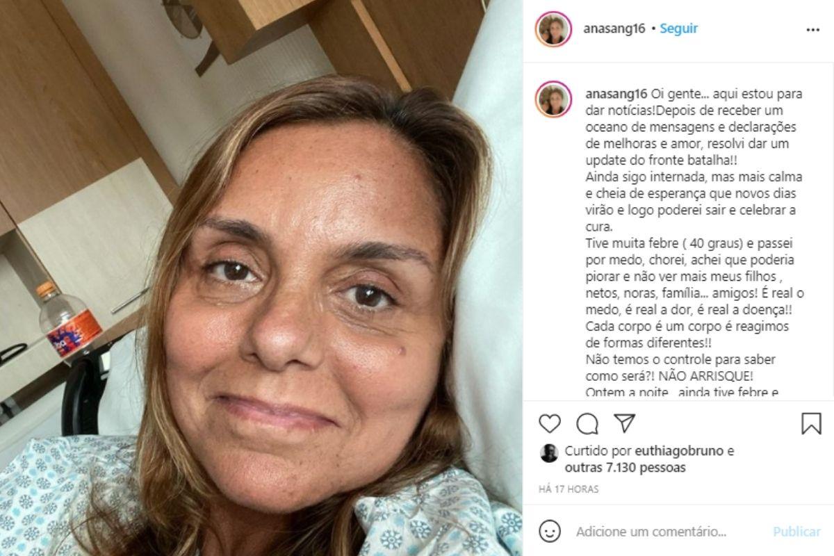 Agora em casa, Ana disse que foi um susto ao testar positivo para a covid-19. “Finalmente estou em casa depois de cinco dias internada. Foi um susto. Ainda estou em recuperação. Covid-19 atacou meu fígado. Os meninos têm cuidado de mim. Fazem rodízio. Estou me recuperando. Ainda tenho alguns exames pela frente, mas estou bem. Obrigado pelo carinho de todos que se preocuparam comigo”, disse.