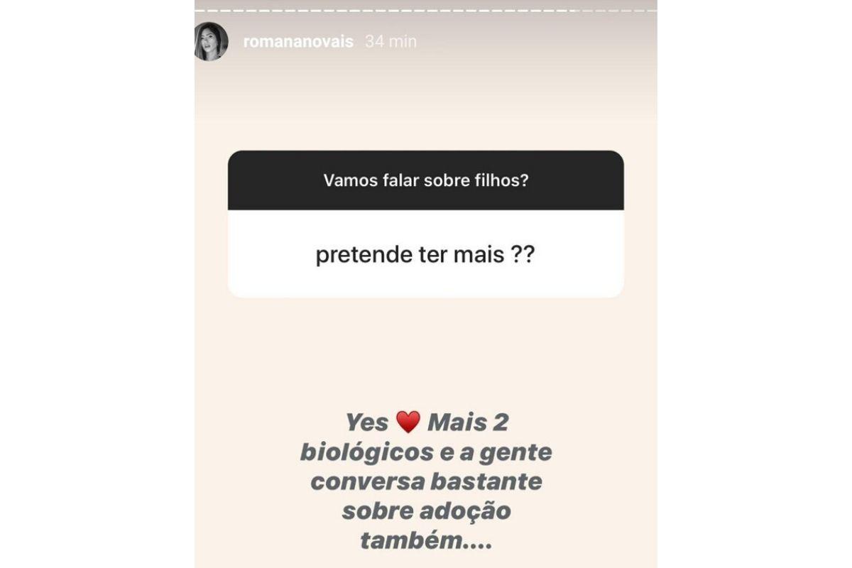 Romana Novais respondeu algumas perguntas relacionadas à maternidade no Instagram nesta quarta-feira, 20 de maio. Ela convidou os seguidores a enviarem as dúvidas através de uma função nos stories. Um dos fãs a questionou a respeito da possibilidade dela ter outros filhos com o DJ Alok.