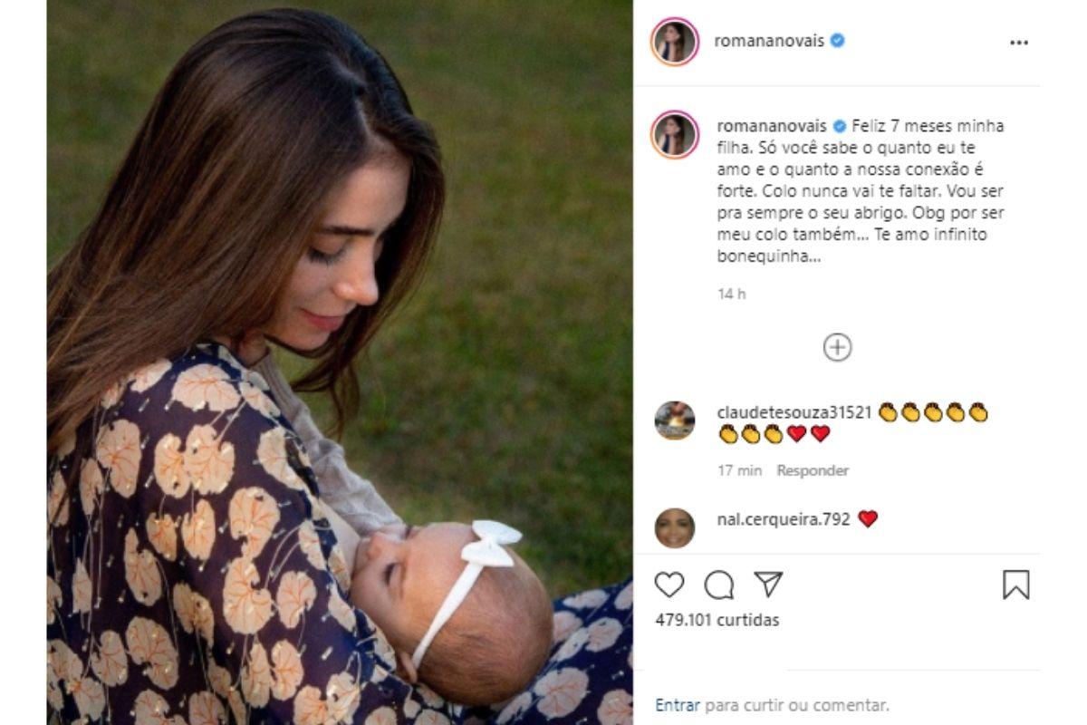 “Feliz 7 meses minha filha. Só você sabe o quanto eu te amo e o quanto a nossa conexão é forte”, ela começa a declaração no texto. Na foto, Romana aparece olhado carinhosamente para a bebê, que está com a mão esticada no pescoço da mãe.