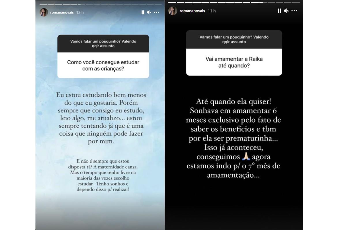 Romana Novais aproveitou a noite da última quarta-feira (23) para interagir com os seguidores nas redes sociais. Ela abriu uma caixa de perguntas no Instagram e comentou sobre vários aspectos da maternidade e da rotina em família, com Alok, Ravi e Raika.