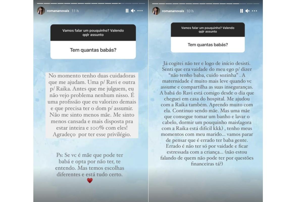 Romana também respondeu sobre a ajuda que tem de babás. “No momento tenho duas cuidadoras que me ajudam: uma para Ravi e outra para Raika. Antes que me julguem, eu não vejo problema nenhum nisso. É uma profissão que eu valorizo demais e que precisa ter o dom para assumir. Não me sinto menos mãe. Me sinto menos cansada e mais disposta pra estar inteira e 100% com eles. Agradeço por ter esse privilégio”.