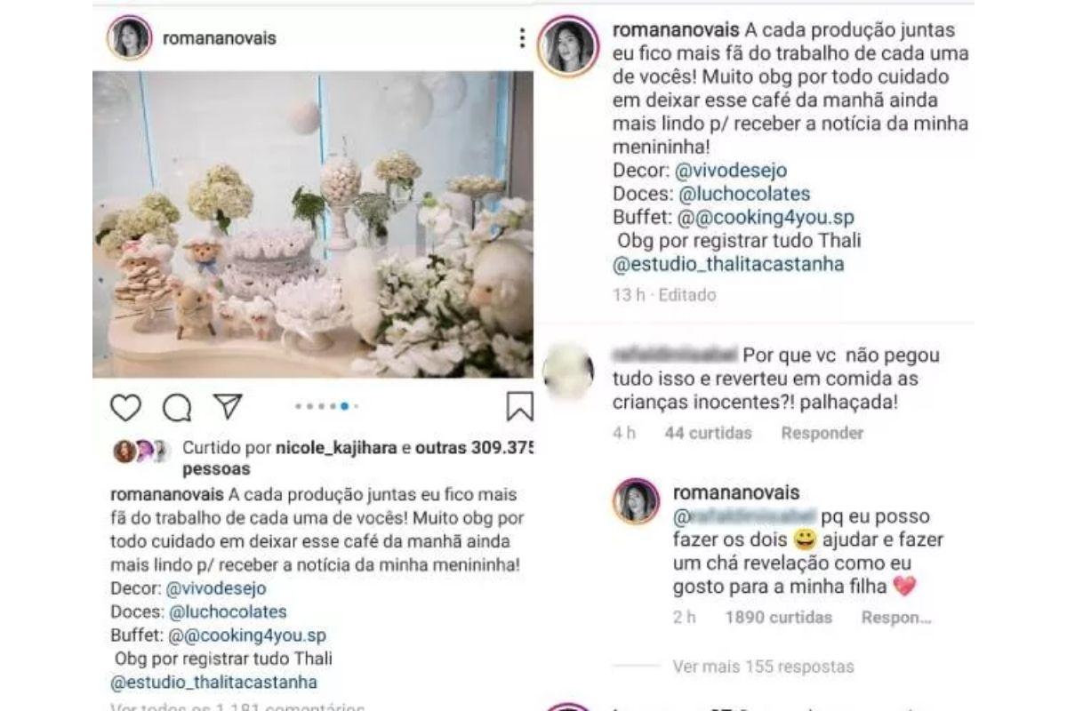 Além disso, Romana compartilhou nas redes sociais detalhes da decoração caprichada para o evento, além de uma mesa de doces farta e uma café da manhã com muitas guloseimas — o chá revelação ocorreu bem cedinho. “Por que você não pegou tudo isso e reverteu em comida as crianças inocentes?! palhaçada!”, questionou a seguidora, após Romana compartilhar fotos da festa. “Porque eu posso fazer os dois. Ajudar e fazer um chá revelação como eu gosto para a minha filha”, rebateu a médica.
