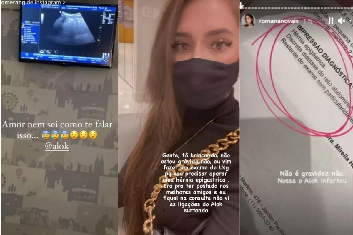 Ao perceber a confusão, a médica correu em nas redes e esclareceu. Romana vai precisar se submeter a uma cirurgia. “Gente, estou brincando. Não estou grávida, não. Vim fazer um exame de USG, porque vou precisar operar uma hérnia epigástrica. Era para ter postado nos melhores amigos, fiquei na consulta e não vi as ligações do Alok surtando”, disse. Em seguida, ela publicou uma imagem do exame. “Não é gravidez não. Nossa, o Alok infartou”, escreveu na legenda.