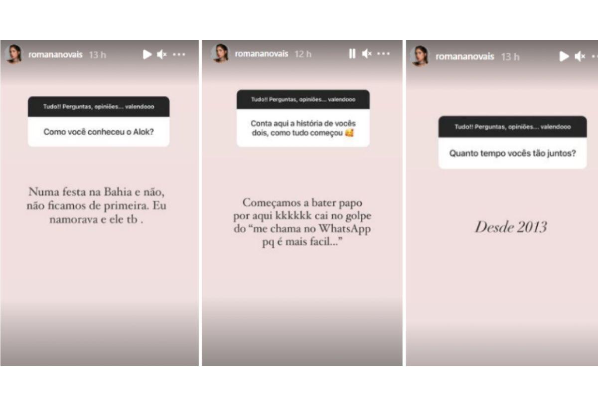 Romana Novais usou as redes sociais mais cedo, para responder algumas perguntas dos internautas sobre a relação com o DJ Alok. Por meio dos Stories do Instagram, ela contou onde os dois se conheceram e também falou sobre alguns momentos da relação.