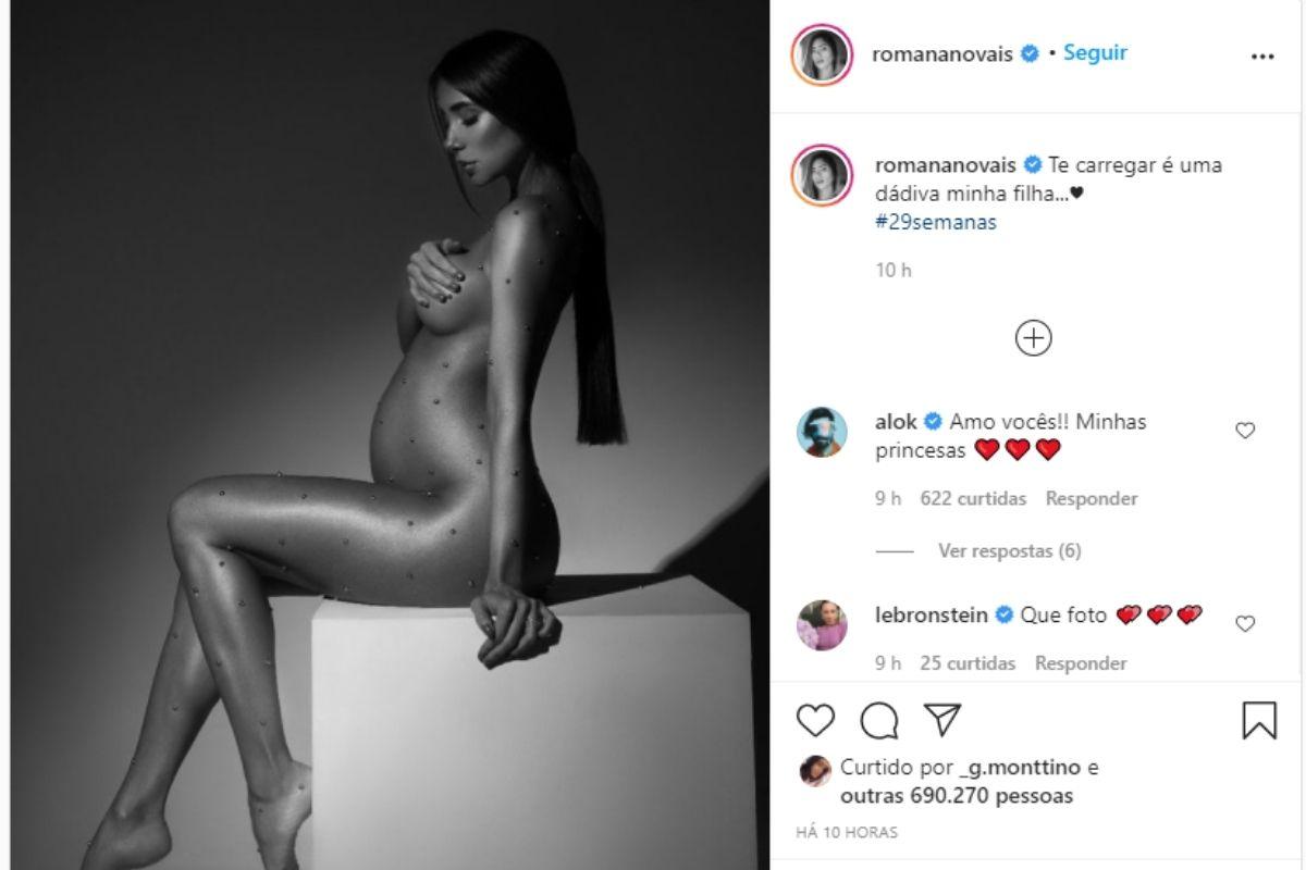 Na imagem ela aparece nua em um registro de um ensaio fotográfico, feito em preto e branco. “Te carregar é uma dádiva minha filha… #29semanas”, se derreteu a Romana na legenda da foto. Diante da foto, Alok também se declarou para a esposa. “”Amo vocês!! Minhas princesas”, declarou o DJ.