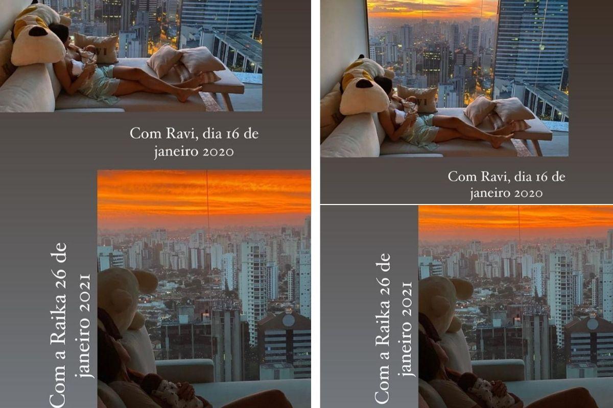 Na publicação dos Stories, Romana mostra duas fotos semelhantes, a primeira com Ravi no colo, olhando para a vista. Já na segunda, a médica surge ao lado da filha, admirando o nascer do sol. Nos retratos, ela surge amamentando os herdeiros. “Com Ravi, dia 16 de janeiro 2020. Com a Raika, 26 de janeiro de 2021”, escreveu ela na legenda da publicação. Confira a imagem abaixo: