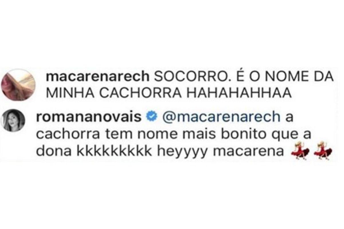 “Socorro. É o nome da minha cachorra hahahahahaha”, escreveu uma internauta, cujo perfil tem o nome de Macarena. “A cachorra tem nome mais bonito que a dona kkkkkk Heeeeey Macarena”, rebateu Romana. Tempos depois, a influenciadora digital apagou o comentário, mas continuou defendendo a escolha e respondendo outras críticas.