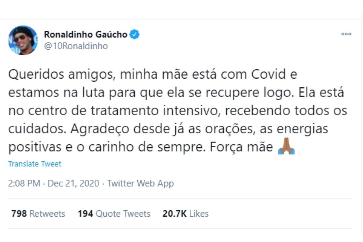Ronaldinho Gaúcho usou as redes sociais nesta segunda-feira, 21 de dezembro, para compartilhar uma notícia difícil com os fãs: a mãe dele está internada com Covid-19. Miguelina Elói Assis dos Santos, de 71 anos, está na UTI recebendo todos os cuidados necessários, como explicou o ex-jogador de futebol.