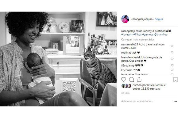 Na legenda ela colocou “Johnny o protetor”, pois o pet está só de olho, cuidando do filho de Jacquin. Essa imagem gerou muito elogios no comentários. Com mais de 19.000 curtidas, as pessoas escreveram: “Exemplo de pessoas, Rosangela… enquanto muitos ai, se desfazendo de seus pets quando engravidam…” e “Que exemplo lindo. Isso mostra o quanto é possível sim, criar pets juntos aos filhos, só nos ensina ainda mais, que o amor e o respeito a todos os seres nesse nosso mundão, só precisam disso.”