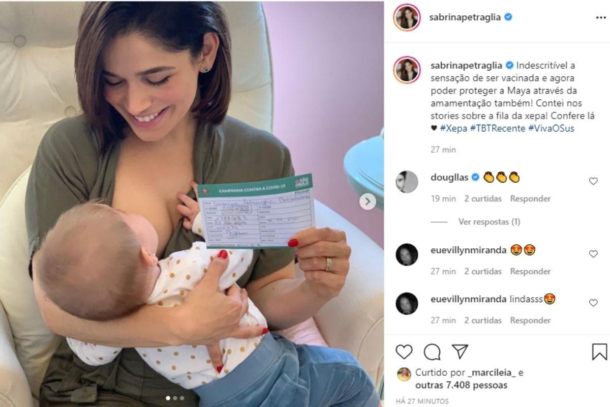 Sabrina Petraglia usou as redes sociais nesta quinta-feira, 8 de julho, para contar uma notícia boa para os internautas: ela recebeu a vacina da covid-19. Para comemorar a imunização, ela compartilhou uma foto em que aparece amamentando a filha, Maya.