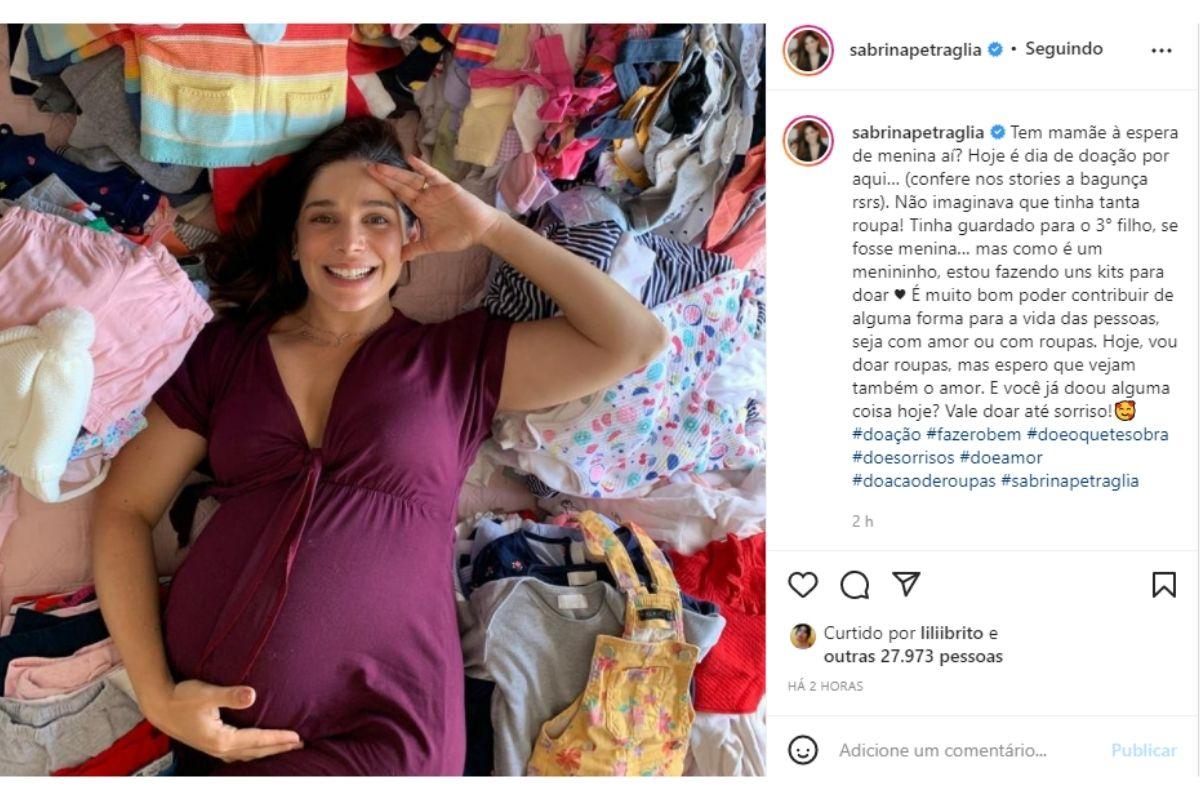 Sabrina Petraglia usou as redes sociais nesta quarta-feira, 14 de fevereiro, para contar um pouco sobre a doação que fez de roupas antigas da filha, Maya, de 1 ano. No Instagram, ela disse que tinha guardado as roupas para o terceiro filho, mas como está à espera de um menino, decidiu doar as que não vai reaproveitar.