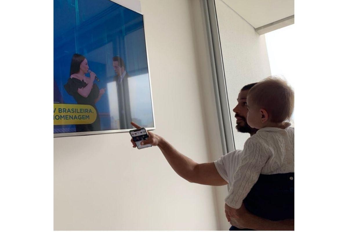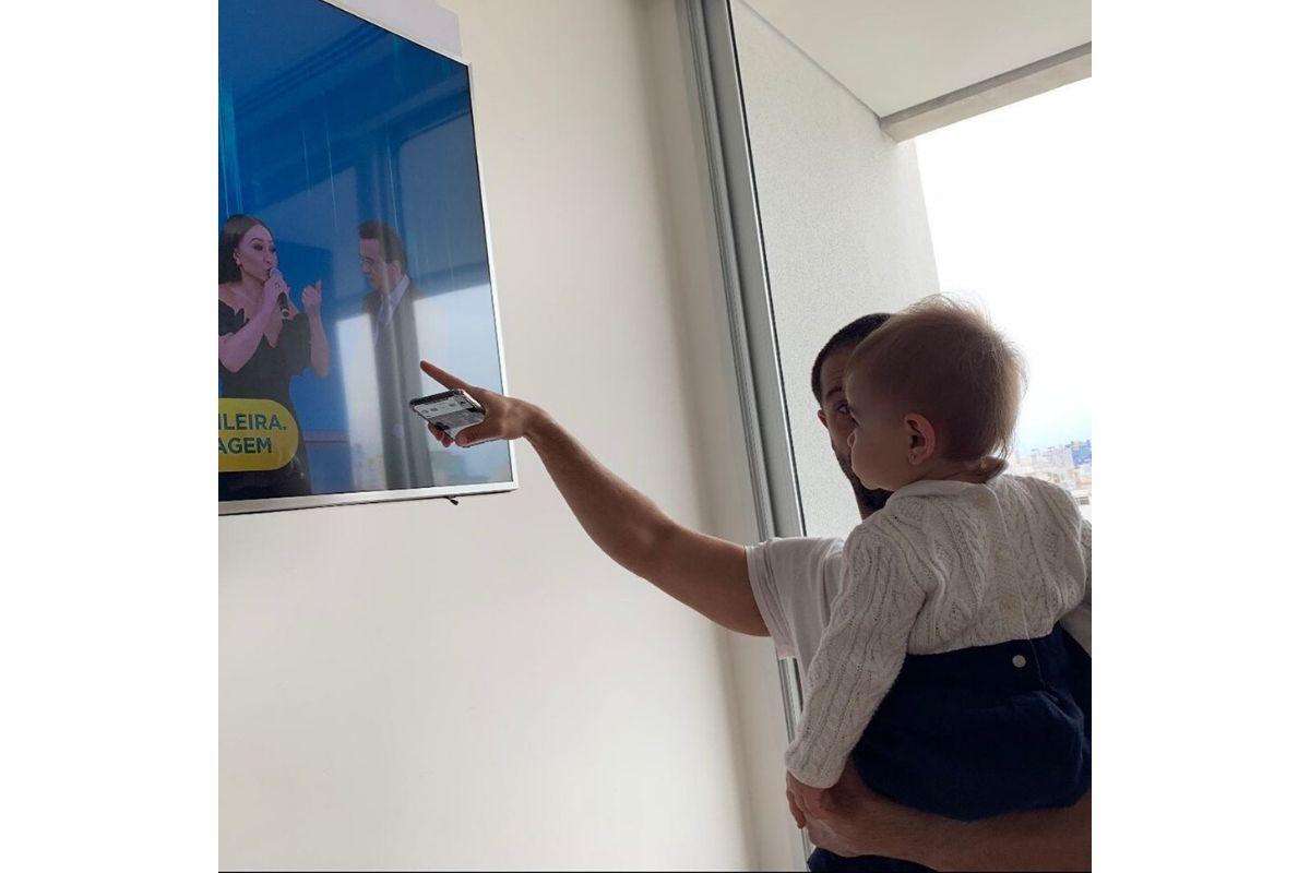 A apresentadora apareceu durante uma homenagem para Gugu Liberato, que faleceu após sofrer um acidente doméstico, na última sexta-feira, 22 de novembro. Ao compartilhar as fotos da família, a avó paterna escreveu: “A primeira vez que Zoe viu a mamãe Sabrina Sato na televisão! Papai Duda mostrando pra ela!”.