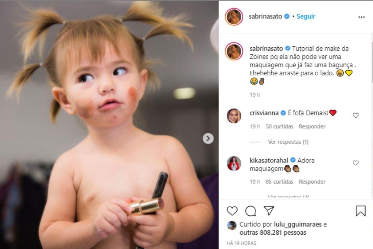 A apresentadora Sabrina Sato usou as redes sociais neste domingo, 16 de agosto para compartilhar alguns cliques da filha, Zoe, se maquiando, Nas imagens, a bebê aparece se olhando no espelho segurando um batom e pincéis de maquiagem. Junto com as fotos, Sabrina Sato falou um pouco sobre o amor que a filha, fruto do relacionamento com o ator Duda Nagle, tem por maquiagens.