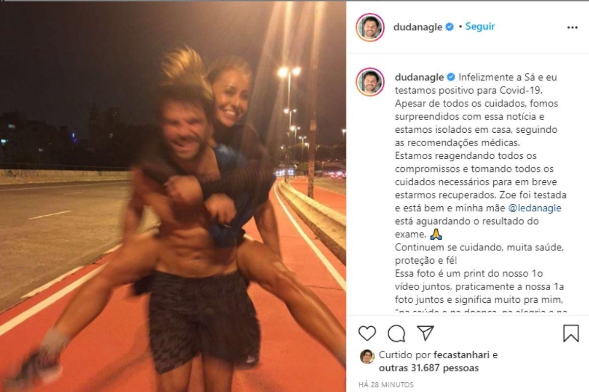 Duda Nagle também compartilhou a notícia no Instagaram.. “Infelizmente a Sá e eu testamos positivo para Covid-19. Apesar de todos os cuidados, fomos surpreendidos com essa notícia e estamos isolados em casa, seguindo as recomendações médicas” começou.