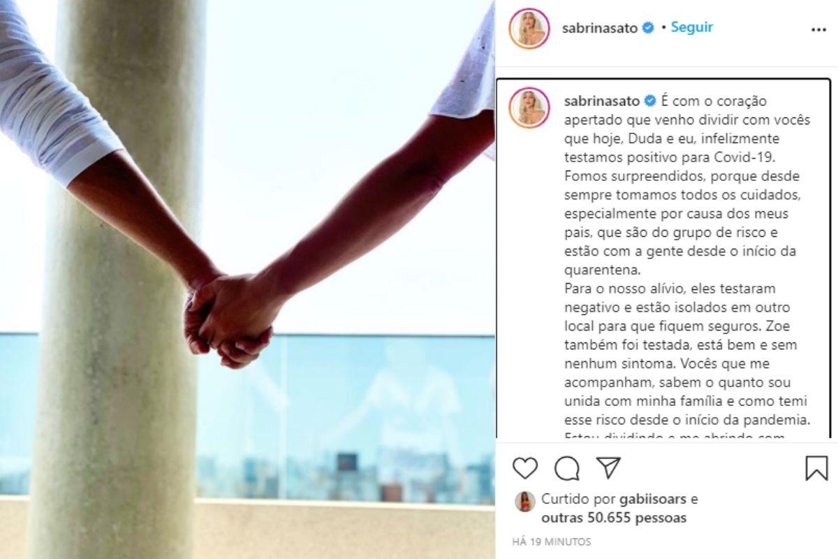 Na imagem, ela aparece de mãos dadas com o marido. “É com o coração apertado que venho dividir com vocês que hoje, Duda e eu, infelizmente testamos positivo para Covid-19. Fomos surpreendidos, porque desde sempre tomamos todos os cuidados, especialmente por causa dos meus pais, que são do grupo de risco e estão com a gente desde o início da quarentena” começou.