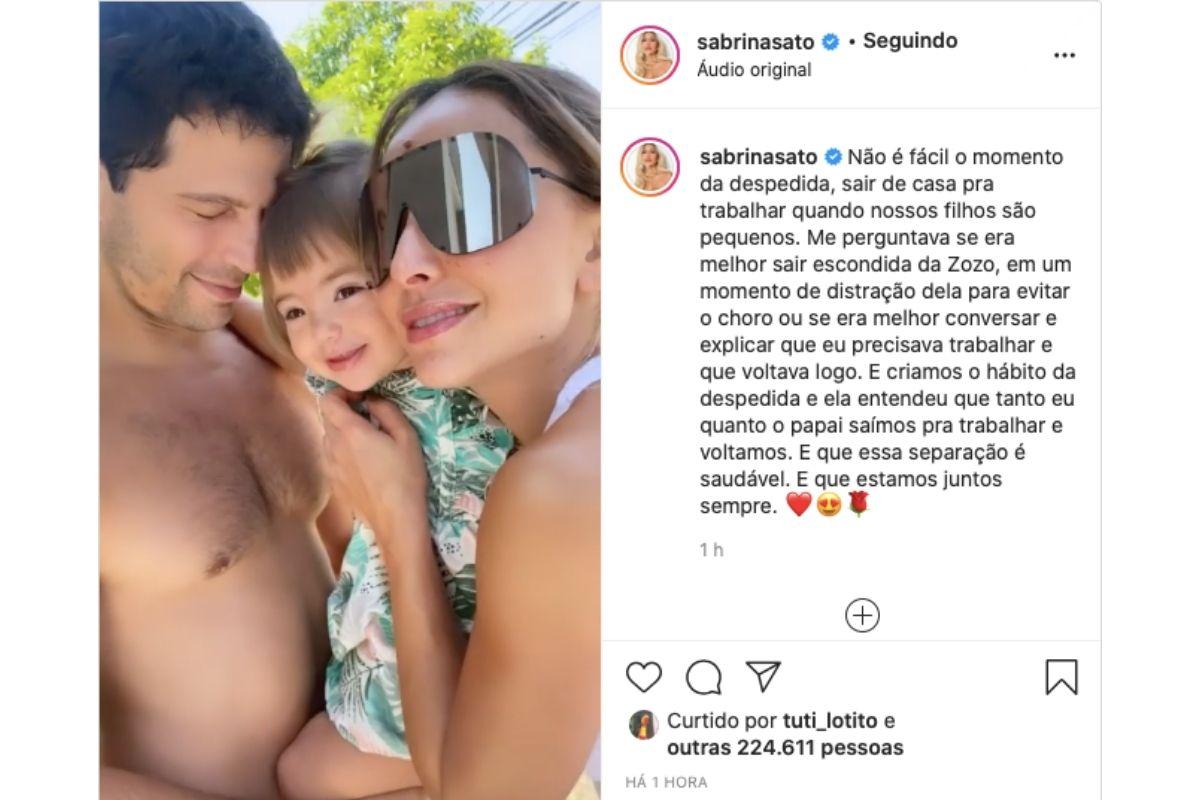 Na gravação a menina diz para Sabrina que a ama, e a mãe babona responde a pequena que também a ama. Nisso o pai fala para Zoe desejar à mãe “bom trabalho” e derrete a famosa pela tamanha fofura. Na legenda a apresentadora abriu o coração: “Não é fácil o momento da despedida, sair de casa pra trabalhar quando nossos filhos são pequenos. Me perguntava se era melhor sair escondida da Zozo, em um momento de distração dela para evitar o choro ou se era melhor conversar e explicar que eu precisava trabalhar e que voltava logo. E criamos o hábito da despedida e ela entendeu que tanto eu quanto o papai saímos pra trabalhar e voltamos. E que essa separação é saudável. E que estamos juntos sempre. ❤️😍🌹”