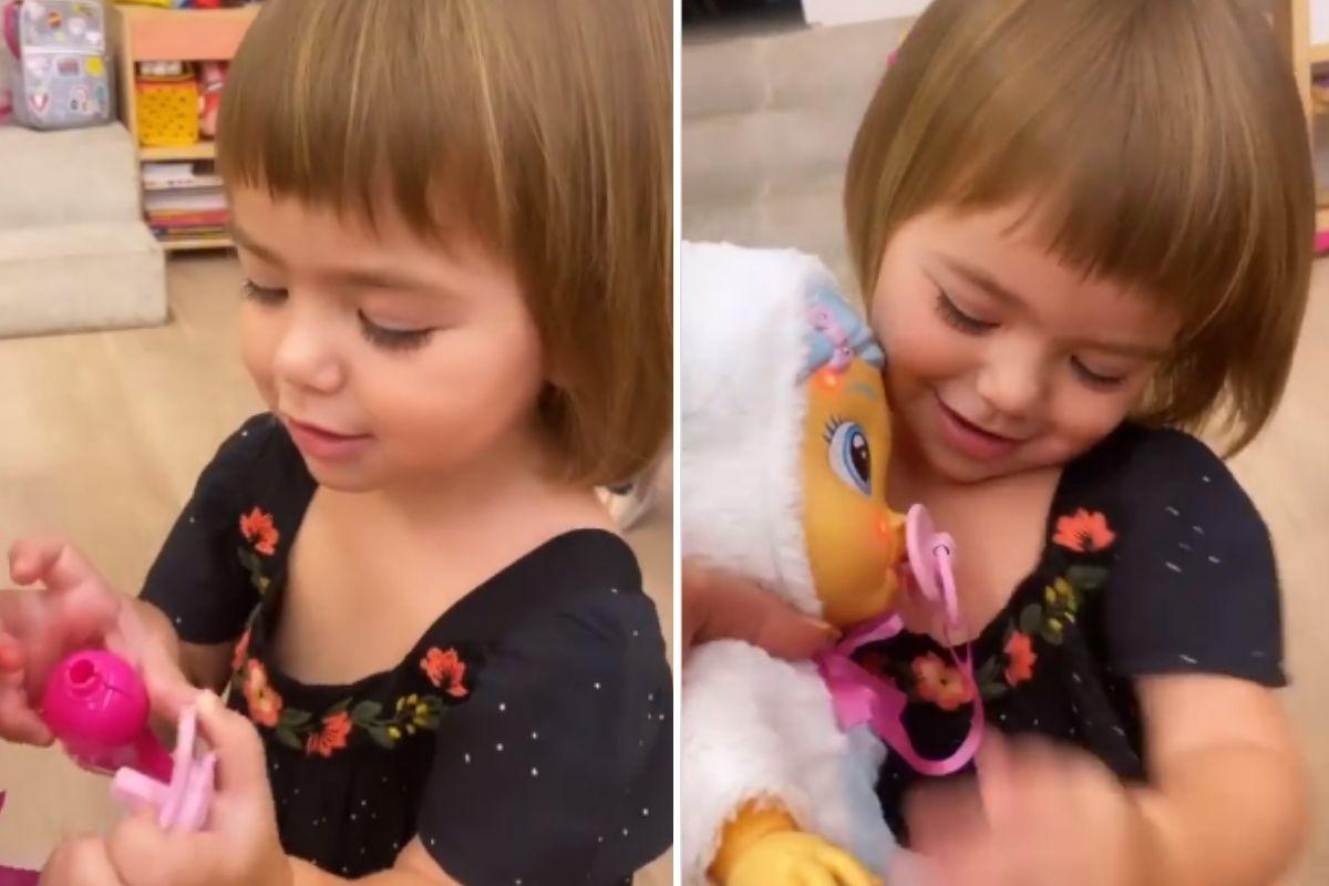 Na cena, Zoe aparece segurando a boneca que faz barulho de choro. “Zoe amou a boneca nova”, escreveu Sabrina na legenda da publicação. A menina também brinca de colocar chupeta e levar o brinquedo para passear, tudo numa tentativa de fazer o “bebê” se acalmar. “Chora bem pouquinho”, completou a mãe no Instagram, se referindo ao som do item.