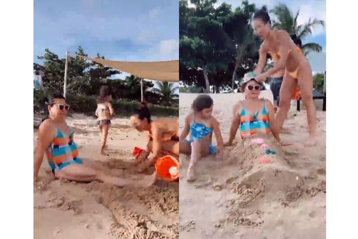 Sabrina Sato publicou um vídeo no perfil do Instagram onde mostra a família se divertindo na praia. A atriz estava enterrando a mãe na areia com ajuda da filha Zoe, 3, indo e voltando no mar para pegar água, e fazer uma calda de sereia na areia, a família ria e se divertia juntos.