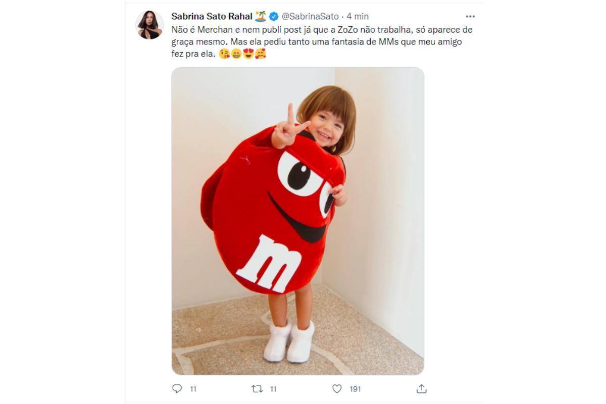 Na foto publicada pela apresentadora, Zoe aparece mostrando um sinal de V com a mão, enquanto está utilizando uma roupa caracterizada de M&M vermelho. “Não é Merchan e nem publi post já que a ZoZo não trabalha, só aparece de graça mesmo. Mas ela pediu tanto uma fantasia de MMs que meu amigo fez pra ela. “, brincou Sabrina na legenda da publicação. Para ver este conteúdo, clique aqui!