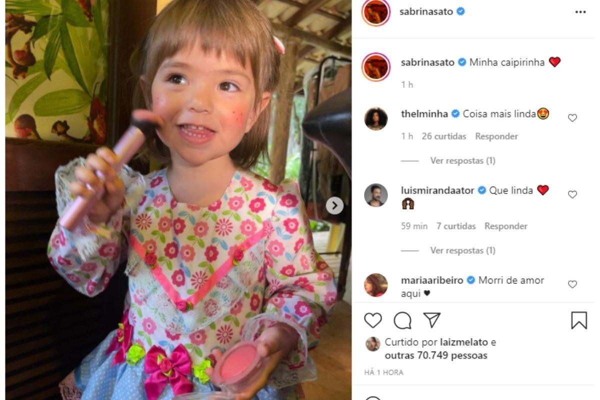 Sabrina Sato usou as redes sociais nesta sexta-feira, 18 de junho, para compartilhar uma série de fotos da filha Zoe, fruto do relacionamento com o ator Duda Nagle. Nas imagens, que foram publicadas no Instagram, a menina aparece se arrumando para uma festa junina, com vestido de caipira e passando maquiagem. “Minha caipirinha”, se declarou ela ao compartilhar a publicação.