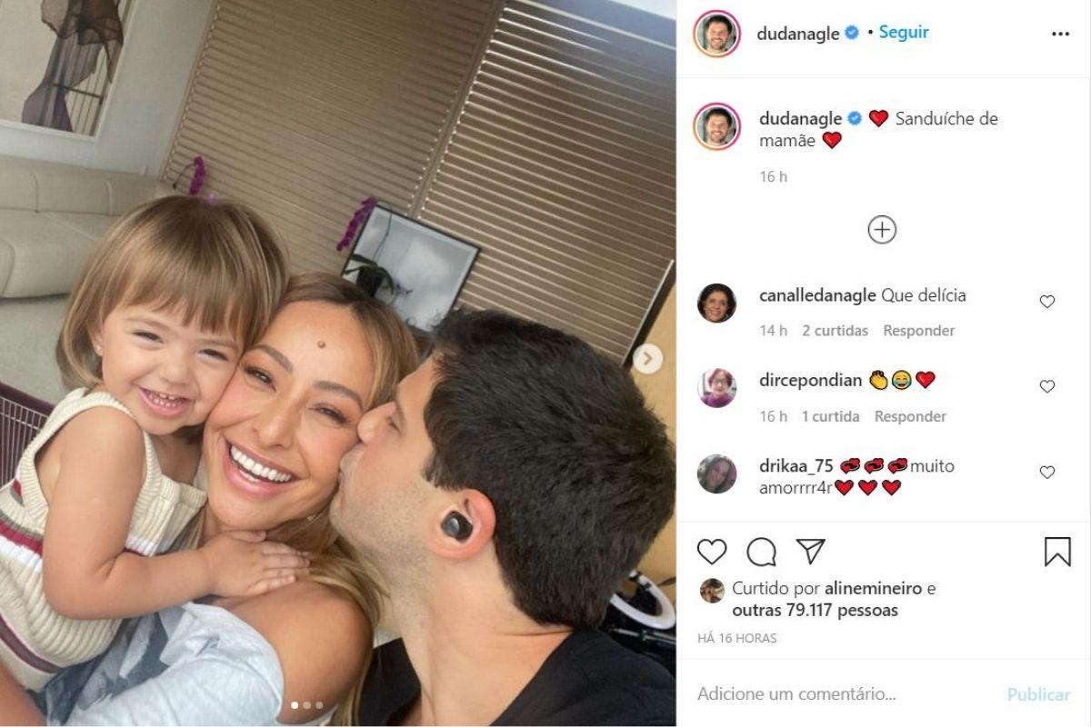 Nesta sexta-feira, 22 de janeiro, Duda Nagle encantou a web ao compartilhar no Instagram um clique fofo da família. O ator pousou ao lado da esposa, a apresentadora Sabrina Sato, e da filha Zoe, de 2 anos. Na imagem compartilhada, ele e a herdeira dão beijos nas bochechas da apresentadora.
