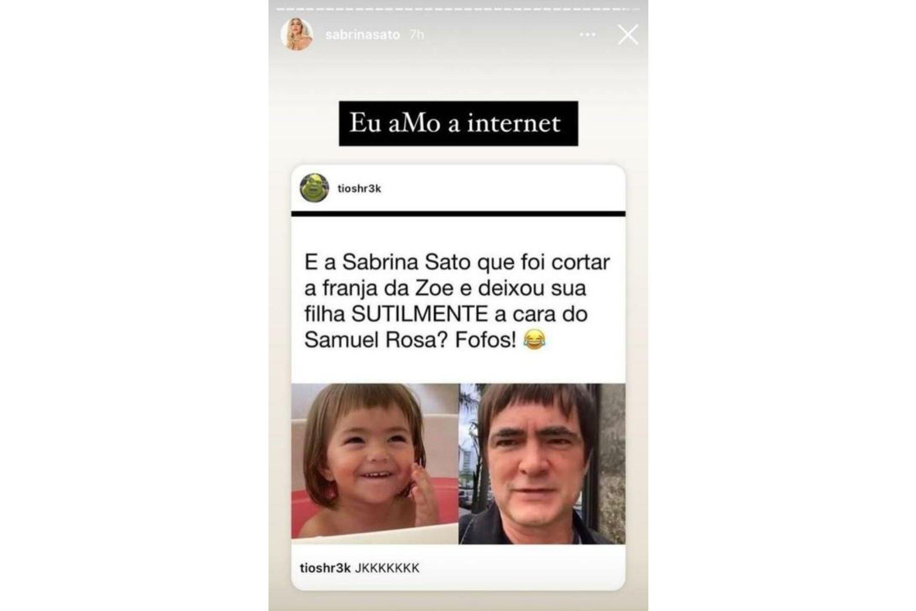 Logo após publicar a imagem, o clique repercutiu e os seguidores de Sabrina Sato começaram a notar a semelhança entre Zoe e Samuel Rosa, vocalista do Skank. “E a Sabrina Sato que foi cortar a franja da Zoe e deixou sua filha SUTILMENTE a cara do Samuel Rosa? Fofos!”, dizia a publicação compartilhada pela apresentadora nos stories do Instagram com a legenda: “Eu amo a internet”.
