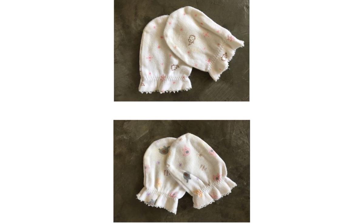 Essas luvas aqui foram usadas pela Mel em seus primeiros dias de vida, dentro e fora da maternidade. A bebê nasceu com as unhas supercompridas e tinha a mania de se arranhar. Os pais, preocupados que a menina se machucasse, resolveram tomar uma atitude.