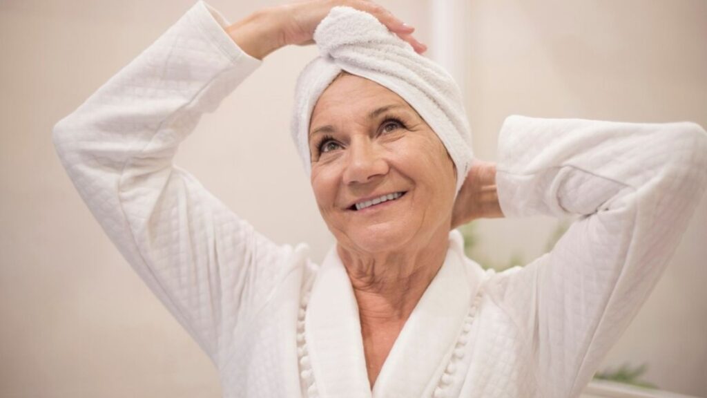 Após o banho, seque-se gentilmente com uma toalha macia, dando leves batidinhas em vez de esfregar a pele. Isso ajuda a evitar microlesões e irritações, mantendo a pele mais protegida. A secagem suave preserva a barreira natural, promovendo maior conforto e saúde para a pele envelhecida, que já é naturalmente mais sensível.