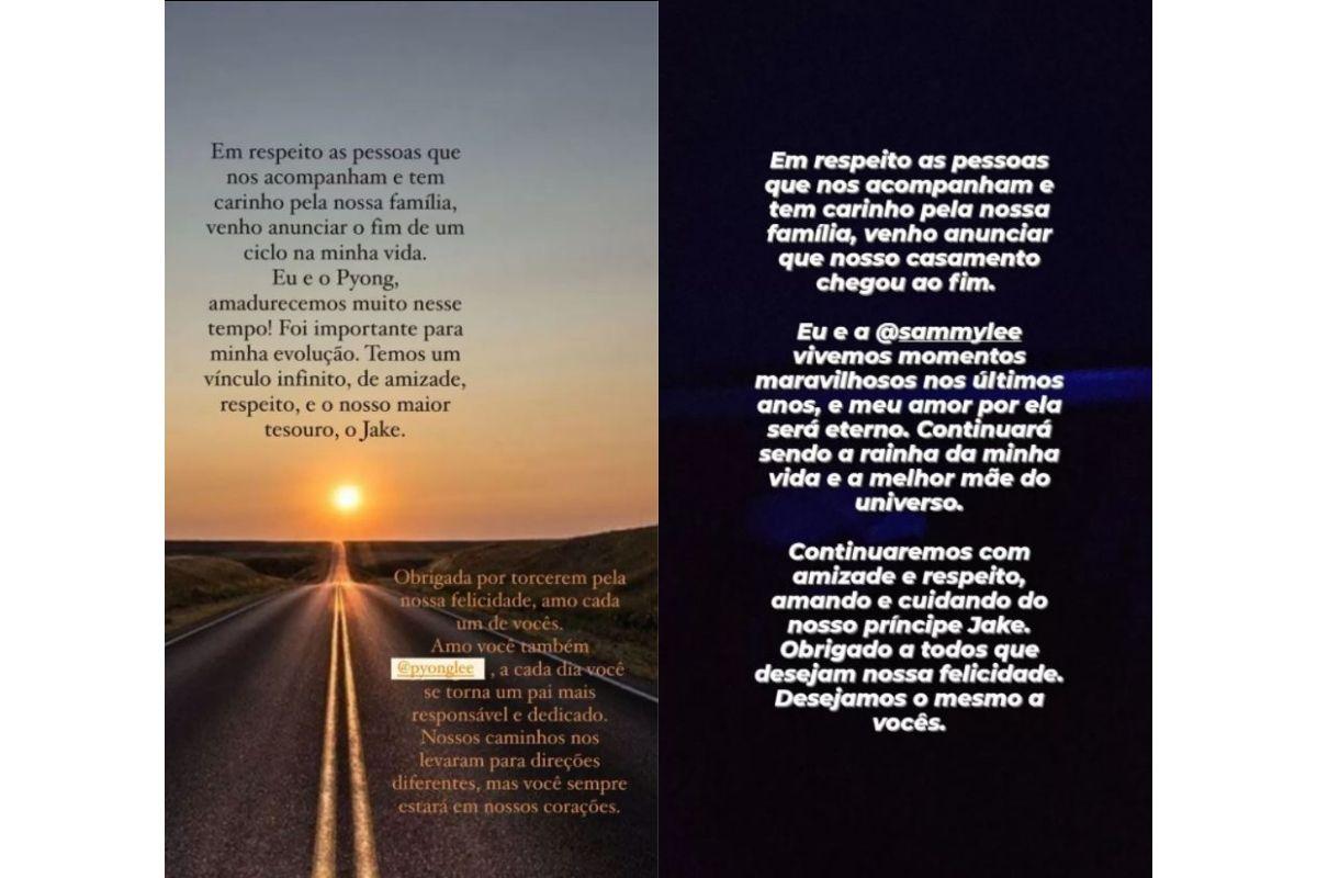 “Em respeito às pessoas que nos acompanham e têm respeito pela nossa família, venho anunciar o fim de um ciclo na minha vida. Eu e Pyong amadurecemos muito nesse tempo. Foi importante para a minha evolução. Temos um vínculo infinito de amizade, respeito, e o nosso maior tesouro, o Jake. Obrigada por torcerem pela nossa felicidade. Amo cada um de vocês”, começou ela.