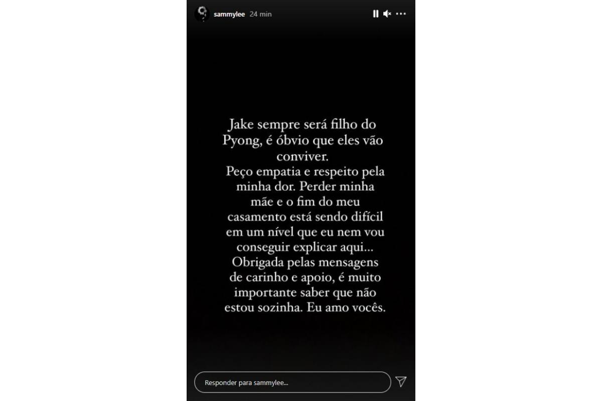 “Jake sempre será filho do Pyong, é óbvio que eles vão conviver. Peço empatia e respeito pela minha dor. Perder minha mãe e o fim do meu casamento está sendo difícil em um nível que eu nem vou conseguir explicar aqui. Obrigada pelas mensagens de carinho e apoio, é muito importante saber que não estou sozinha. Eu amo vocês”, escreveu nos Stories.