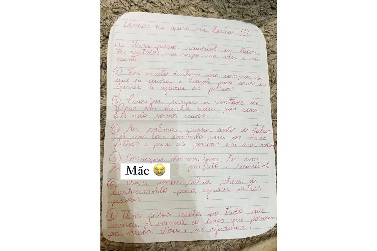“Em fevereiro desse ano, falei pra minha mãe escrever como ela estava, e em outra folha escrever como ela queria ser. Esse sistema ajuda a organizar o pensamento e alcançar melhor os objetivos”, contou a influencer para os seguidores.