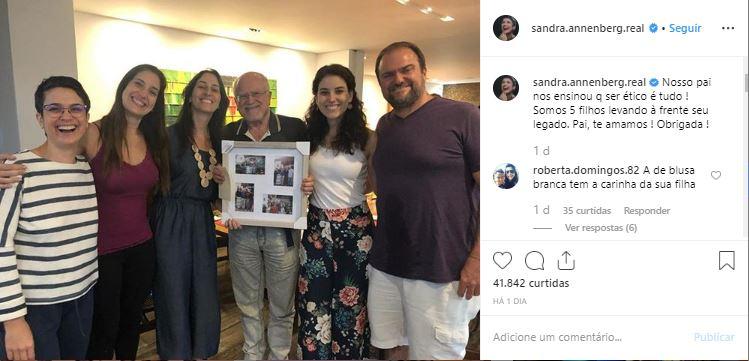 Sandra Annenberg surpreendeu os seguidores ao publicar duas fotos em família. Na primeira publicação, ela posou ao lado dos quatro irmãos e do pai. “Nosso pai nos ensinou que ser ético é tudo! Somos 5 filhos levando à frente seu legado. Pai, te amamos! Obrigada!”, declarou.