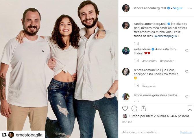 Em seguida, Sandra compartilhou uma foto que o marido, Ernesto Paglia, postou. “No Dia dos Pais, declaro meu amor ao pai desses três amores da minha vida. Feliz todos os dias, Ernesto Paglia!”, declarou a jornalista e apresentadora. Na publicação, estavam os filhos Bernardo e Francisco, e a menina Elisa, de 16 anos, filha de Sandra e do jornalista.