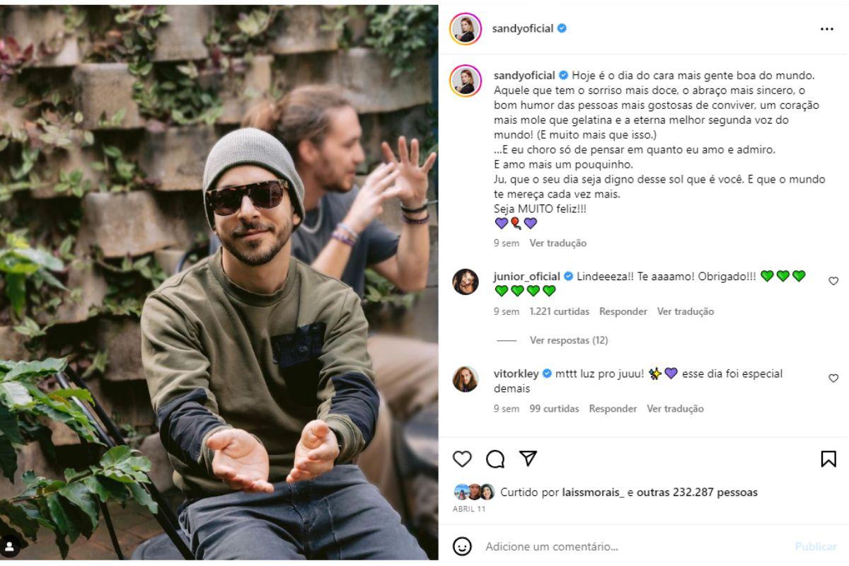 O artista completou 39 anos em abril e recebeu uma homenagem da irmã. Na publicação feita, Sandy falou sobre as qualidades do irmão, além de desejar o parabéns. “Hoje é o dia do cara mais gente boa do mundo. Aquele que tem o sorriso mais doce, o abraço mais sincero, o bom humor das pessoas mais gostosas de conviver, um coração mais mole que gelatina e a eterna melhor segunda voz do mundo! (E muito mais que isso)”, escreveu.