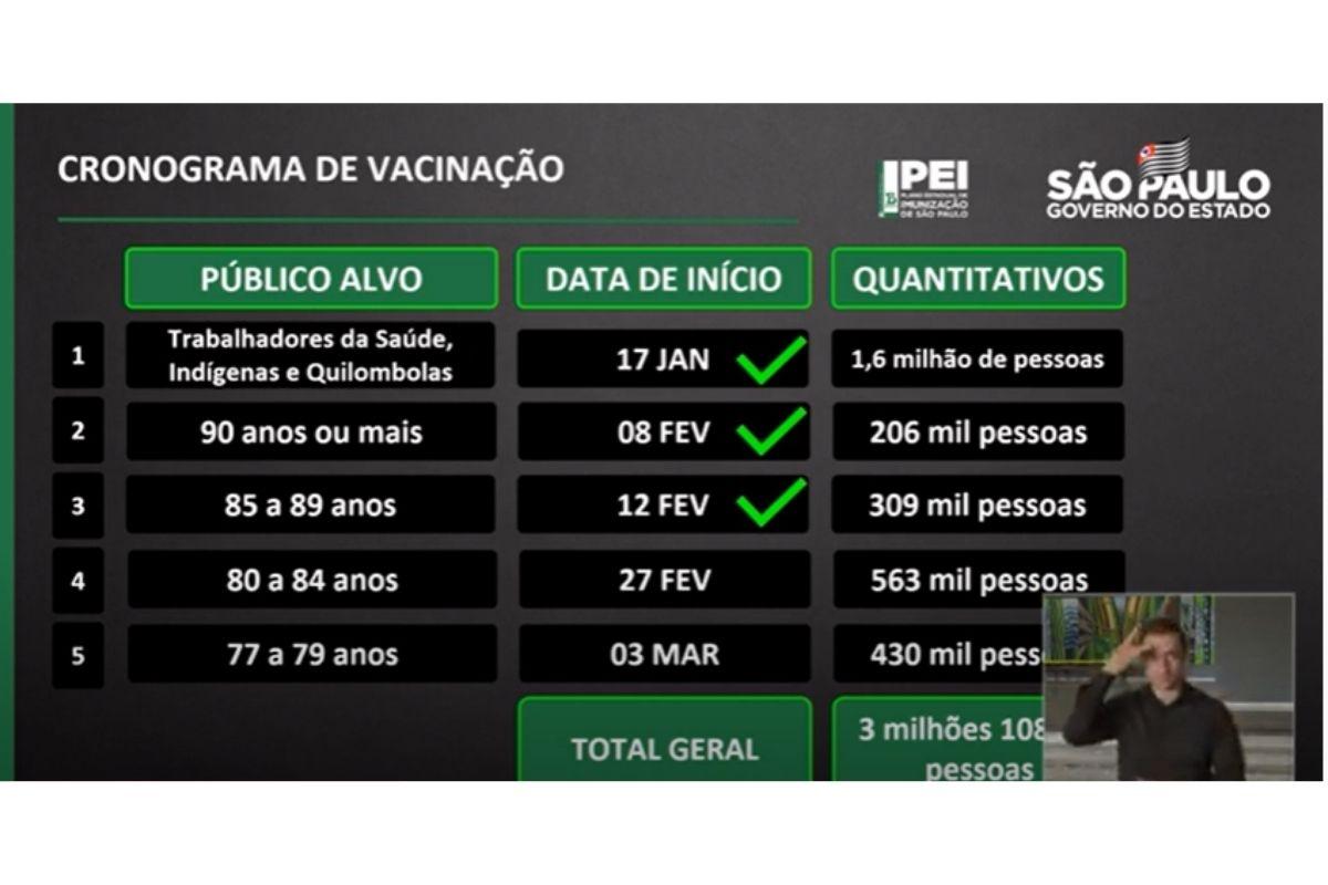 Durante uma coletiva de imprensa realizada nesta sexta-feira, 26 de fevereiro, o governo do estado de São Paulo anunciou novas datas para a vacinação de idosos de 80 a 84 anos, e também de 77 a 79 anos. Para a primeira faixa etária, a previsão de início era 1º de março, mas foi antecipada.