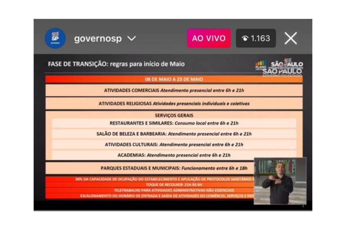 Nesta sexta-feira, 07 de maio, o governo do estado de São Paulo realizou uma coletiva de imprensa para anunciar novas medidas para conter a pandemia de coronavírus. O governador João Doria anunciou que a fase de transição do plano São Paulo será prorrogada por mais duas semanas – o que muda é o horário comercial, que foi ampliado até às 21h.