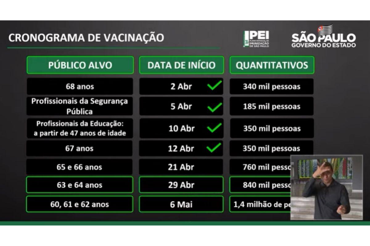 A novidade, informada por Regiane de Paula, coordenadora geral do programa estadual de imunização, é de que idosos de 60, 61, 62,63 e 64 anos serão imunizados contra a covid-19 nas próximas semanas. Pessoas com 63 e 64 anos, podem tomar a vacina a partir de 29 de abril, representando 840 mil doses. De 60, 61 e 62 anos em 6 de maio, com 1,4 milhão de pessoas.
