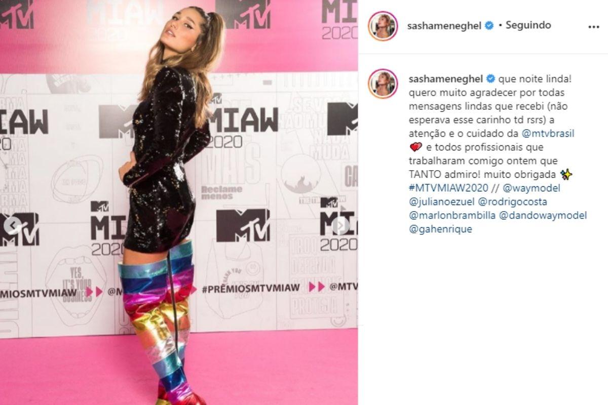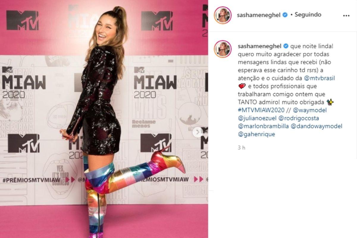 Quando publicou as fotos nas redes sociais, a atriz escreveu: “Que noite linda! quero muito agradecer por todas mensagens lindas que recebi (não esperava esse carinho td rsrs) a atenção e o cuidado da MTV e todos profissionais que trabalharam comigo ontem que TANTO admiro! muito obrigada”. Sasha foi uma das apresentadoras da premiação, ao lado de Manu Gavassi e Bruna Marquezine.