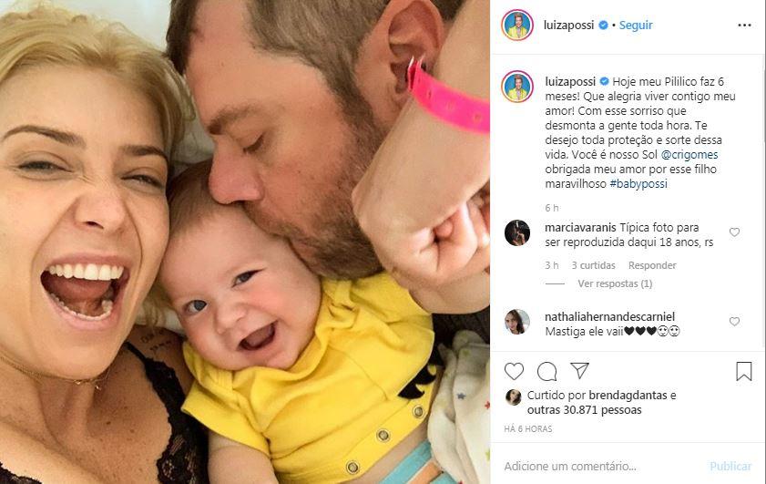 “Hoje meu Pililico faz 6 meses! Que alegria viver contigo, meu amor! Com esse sorriso que desmonta a gente toda hora. Te desejo toda proteção e sorte dessa vida. Você é o nosso Sol. Cris Gomes, obrigada meu amor, por esse filho maravilhoso”, declarou Luiza na legenda da primeira foto.