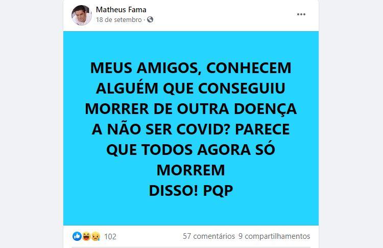 Em postagem em sua rede social, no dia 18 de setembro, o cantor sertanejo chegou a questionar se a doença realmente existia. “Meus amigos, vocês conhecem alguém que conseguiu morrer de outra doença a não ser Covid? Parece que todos agora só morrem disso!”, reclamou. “Ninguém se pergunta por que na China não tem mais ninguém infectado? Milagre? Que mundo é esse? Podre”, diz a postagem.