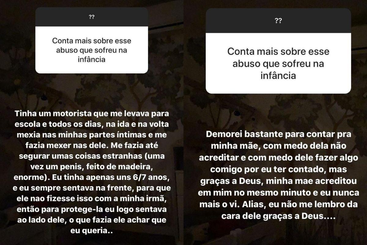 “Demorei bastante para contar para a minha mãe, com medo dela não acreditar e com medo dele fazer algo comigo por ter contado. Minha mãe acreditou em mim no mesmo minuto e eu nunca mais o vi. Aliás, não me lembro da cara dele, graças a Deus”, finalizou.