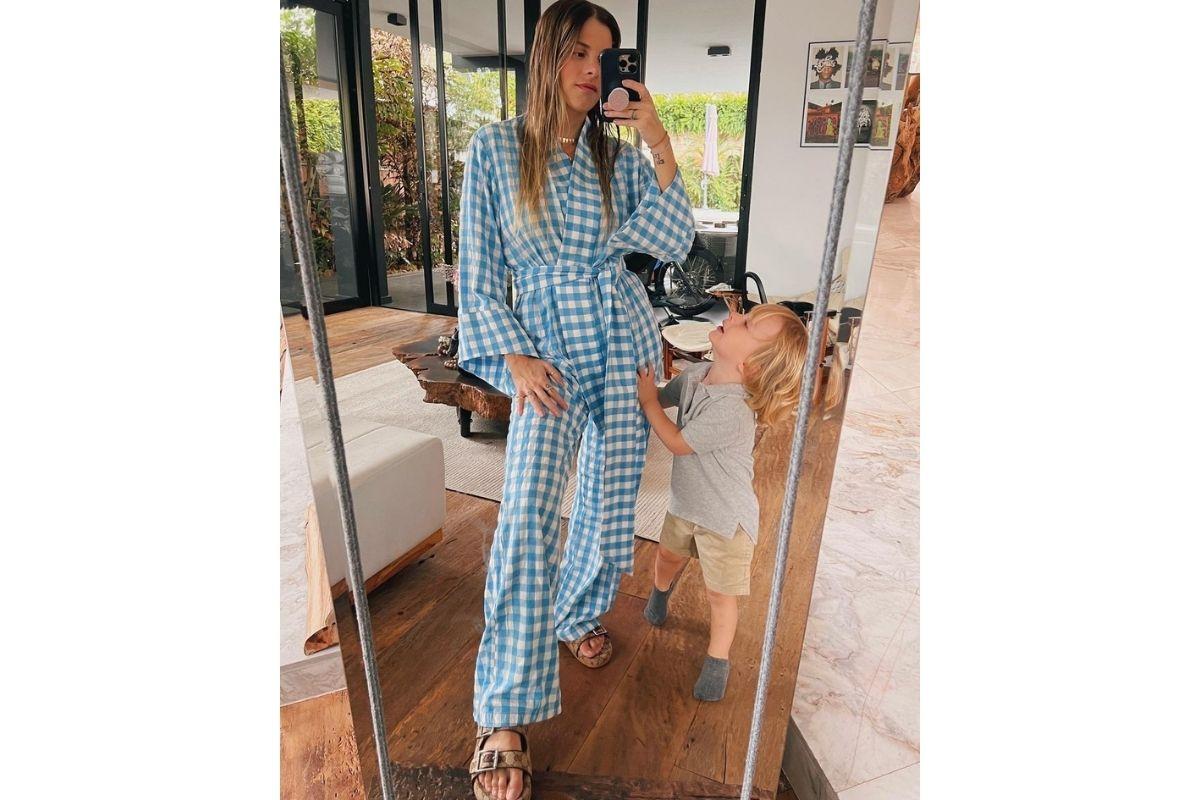 De frente para um espelho, Shantal mostrou o vestido que estava usando – mas quem roubou a cena foi Pippo, que apareceu agarrado à saia da mãe. “Tentando fazer uma foto da roupa e um bebê chorando querendo docinho antes do almoço”.