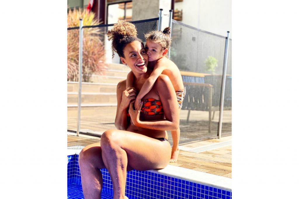 Na imagem, publicada em sua conta no Instagram, ela aparece em uma piscina com seu filho a abraçando e dando um beijo na bochecha. Além do momento família, ela também mostrou que seu filho está virando uma criança de atitude!