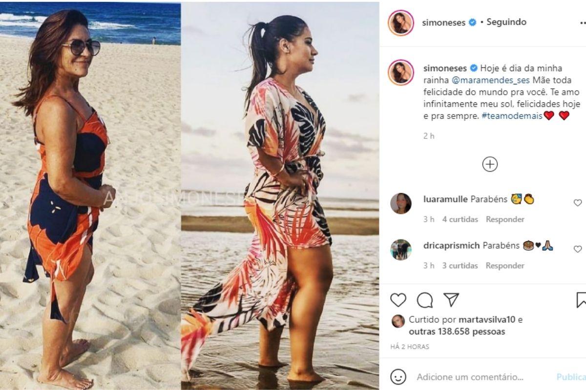 A cantora Simone, também usou as redes sociais nesta para compartilhar uma montagem de fotos. Na montagem, a famosa uniu uma foto dela na praia ao lado de uma foto da mãe, Mara, também na praia. A cantora aproveitou a foto para fazer uma pequena homenagem à mãe.