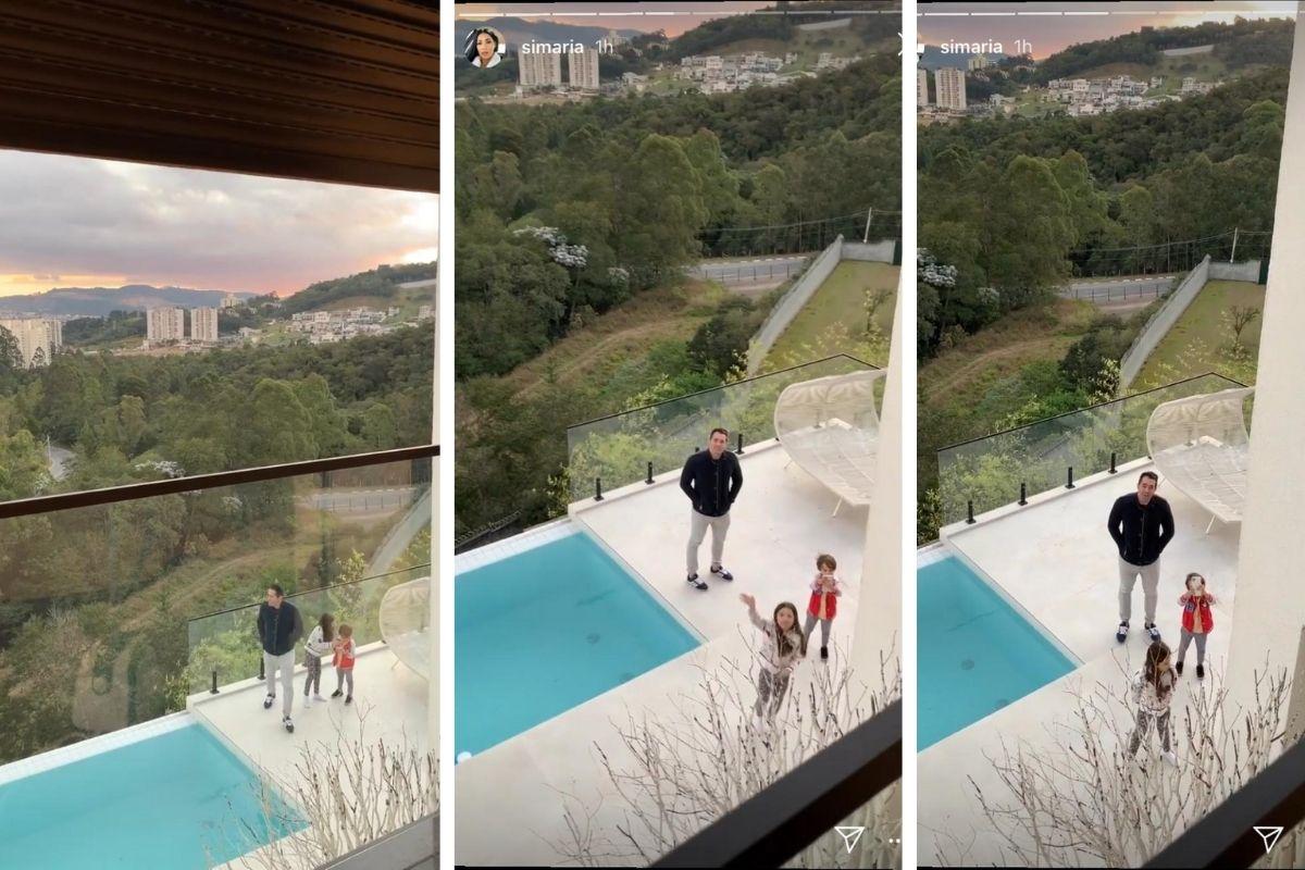 Nas imagens, as crianças e o espanhol aparecem na área externa da mansão, perto da piscina. “Oi, filhos! Meus bebês! Coisas lindas da mamãe. Vocês tão fazendo vídeo meu? Minha palhacinha!”, brincou Simaria da varanda.