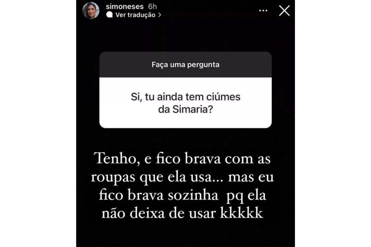 Um fã questionou a cantora se ela teria ciúmes de Simaria – e Simone não pensou duas vezes para confirmar. “Tenho e fico brava com as roupas que ela usa… mas eu fico brava sozinha, porque ela não deixa de usar [risos]”. Os fãs se divertiram com a confissão.