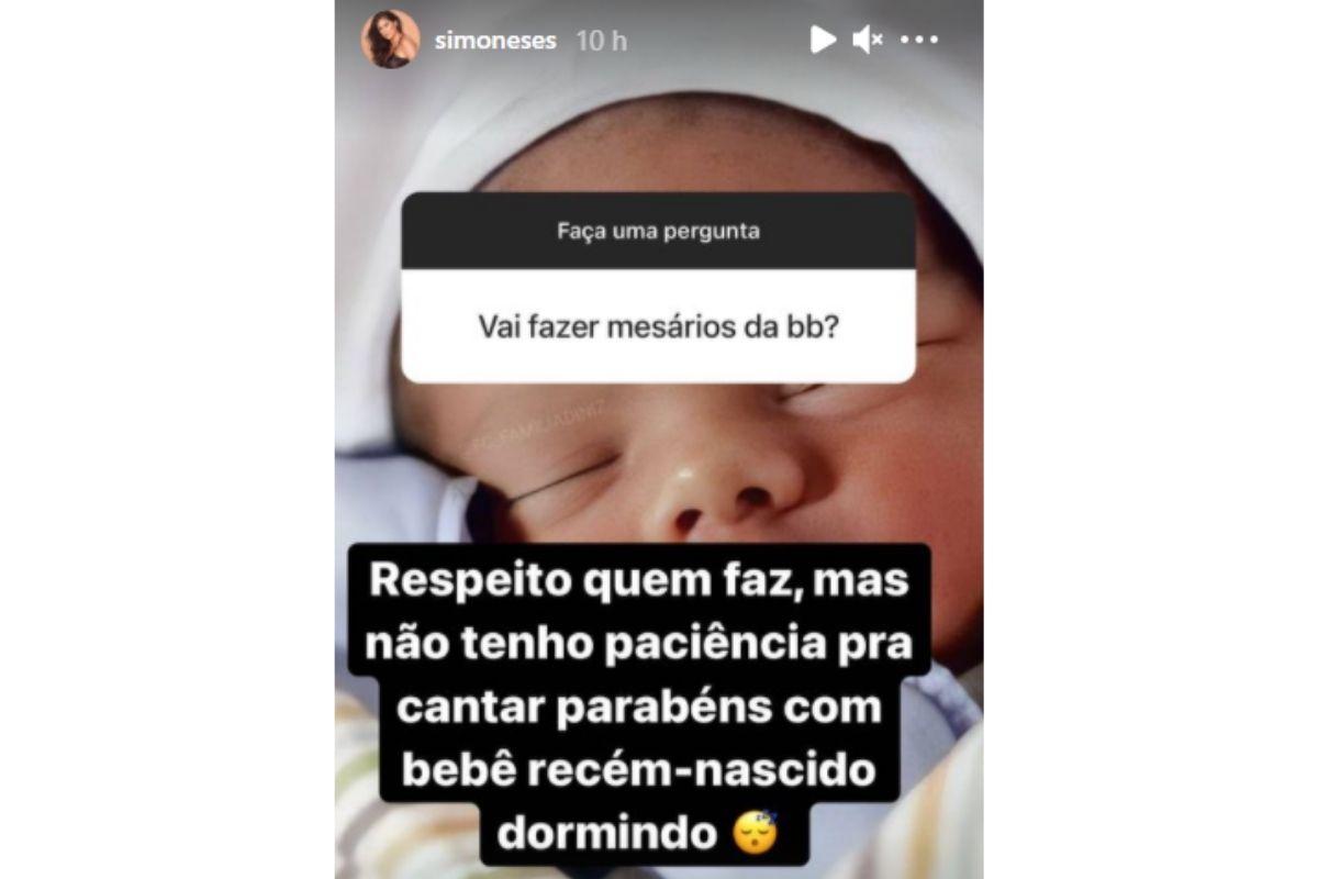 A famosa, que também é mãe de Henry, contou que não pretende fazer festas mensais para Zaya e disse, ainda, que não tem muita paciência para essas comemorações. Simone falou sobre o assunto nos stories do Instagram, depois de ser questionada a respeito por um seguidor.