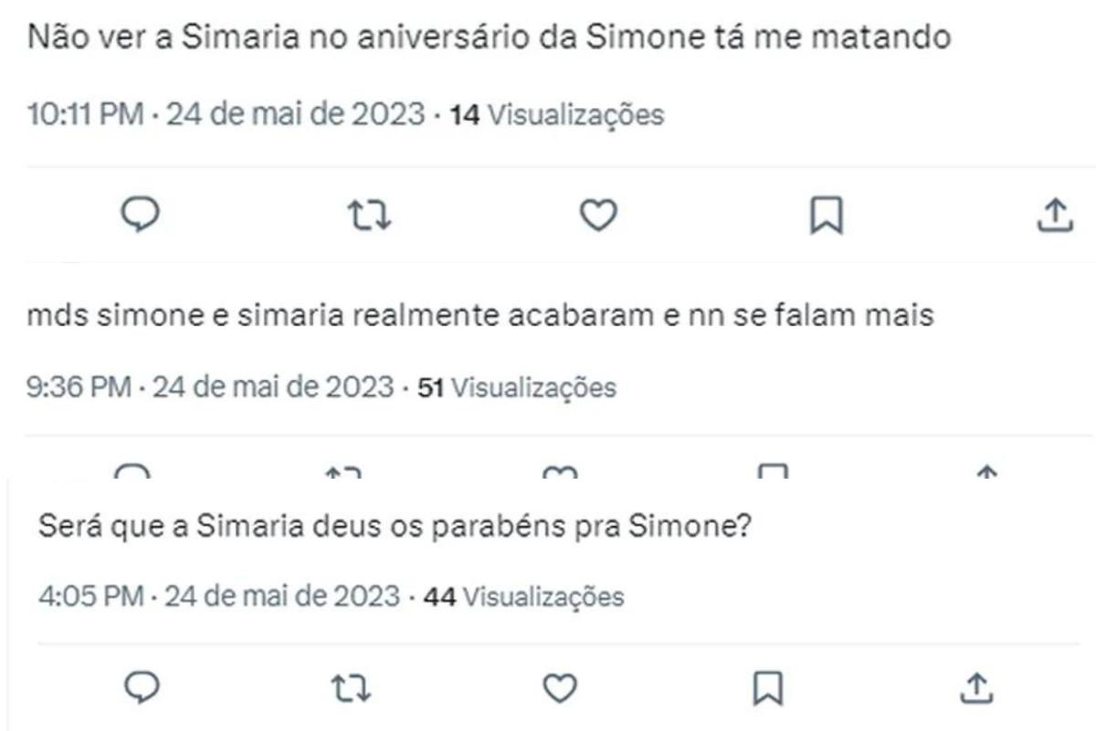 De fato, Simaria não utilizou suas redes sociais para parabenizar publicamente a irmã. Em seu único post no Twitter naquele dia, ela compartilhou uma selfie acompanhada de uma citação filosófica. ” ‘O mundo pertence a quem se atreve e a vida é muito para ser insignificante’ (Augusto Branco). Boa quarta, genteee!!”, escreveu.