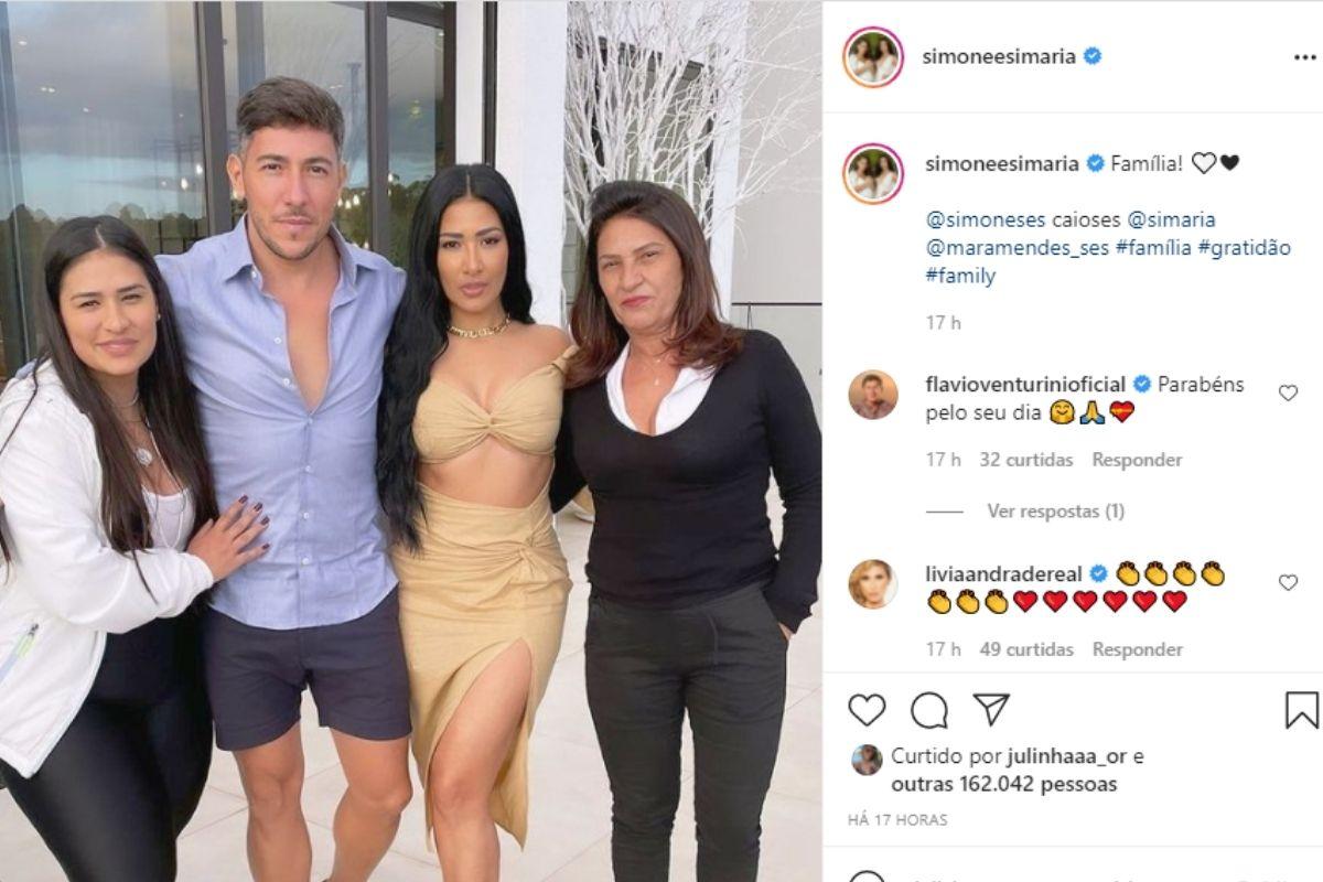 Simone e Simaria usaram o Instagram oficial da dupla nesta quinta-feira, 17 de junho, para compartilhar uma foto das duas em família. Na foto rara, a dupla aparece ao lado da mãe, Mara e do irmão, Caio. “Família”, escreveram as duas na legenda da publicação.
